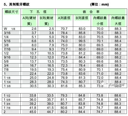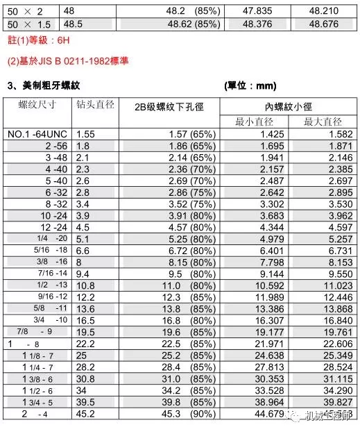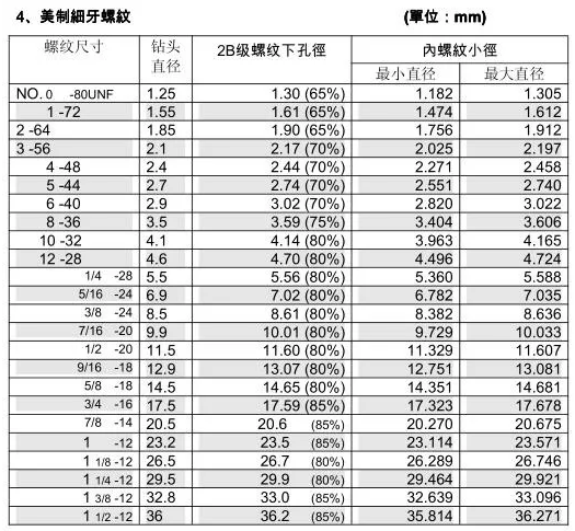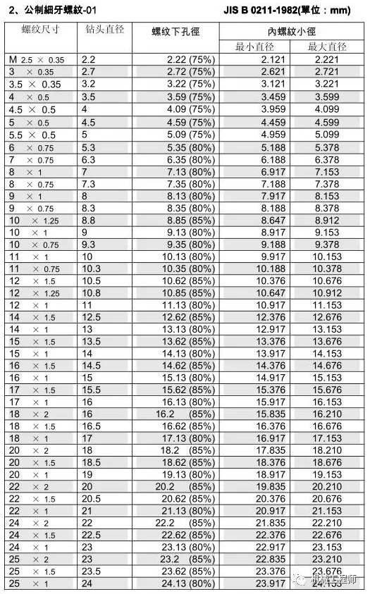 絲錐和鉆頭的參數(shù)對(duì)照表